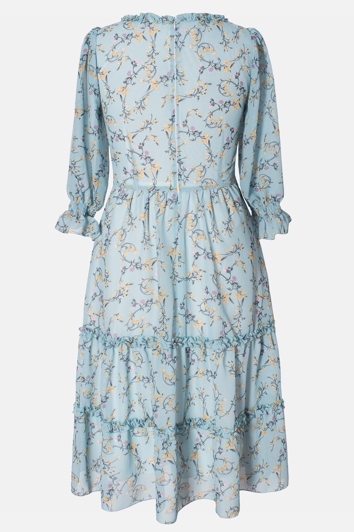 Rochie midi din voal floral bleu, decolteu rotund stilizat, cu volanase in partea inferioara, captuseala in ton, maneca trei sferturi stransa cu elastic in terminatie, inchidere cu fermoar ascuns pe spate.