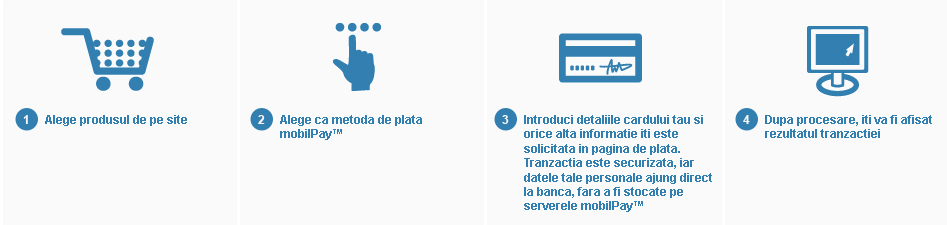 MobilePay este un serviciu de plata sigur si usor care te ajuta sa faci cumparaturi online fara ca sa fii nevoit sa iti expui informatiile cardului de credit sau ale bancii nici unui tert, inclusiv MobilePay™. Siguranta informatiilor dvs. este garantata de faptul ca MobilePay™ nu stocheaza datele confidentiale ale cardului dvs, ci le trimite criptat pe o conexiune securizata catre banca procesatoare. In acest fel informatiile dvs. sunt in siguranta.